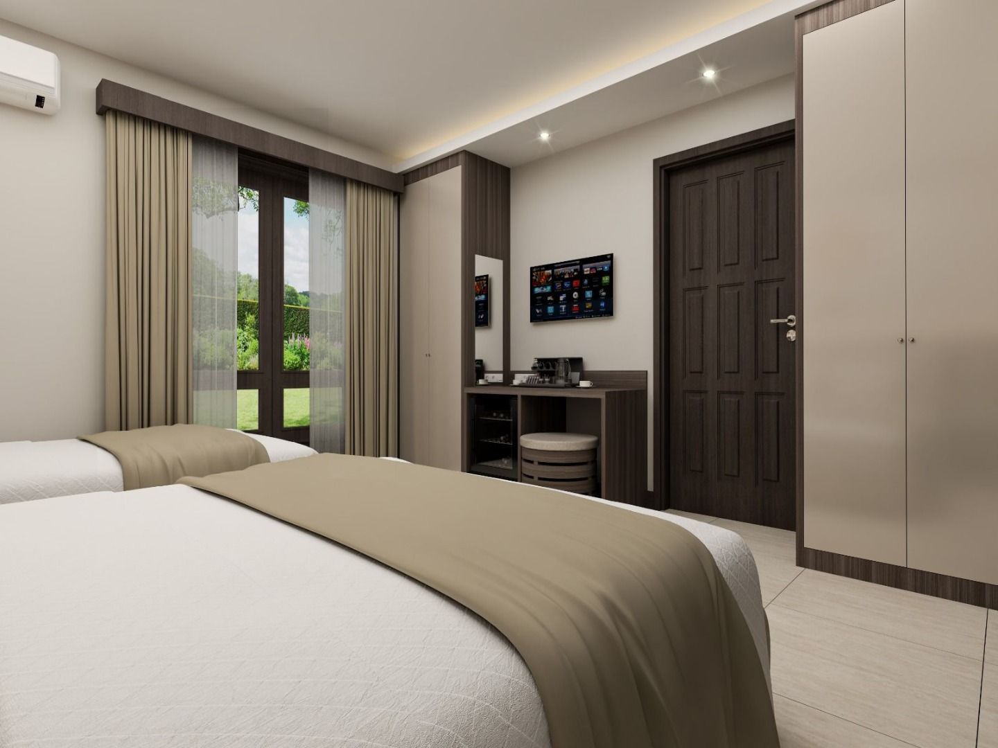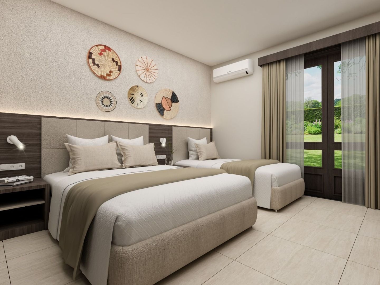 Toutes les chambres Club Triple disposent d'un lit double et d'un lit simple. Elles offrent une vue sur le jardin et une terrasse.
